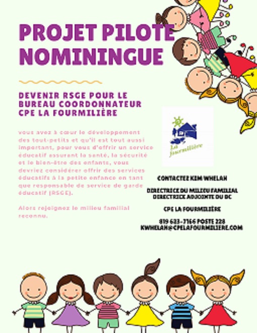 Il y aura un projet pilote à Nominingue, nous sommes à la recherche de requérantes (RSGE). Pour plus d'informations bien vouloir contacter Madamer Kim Whelan au 819-623-7166 poste 228.
